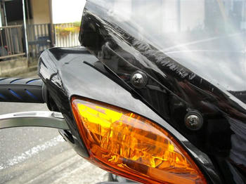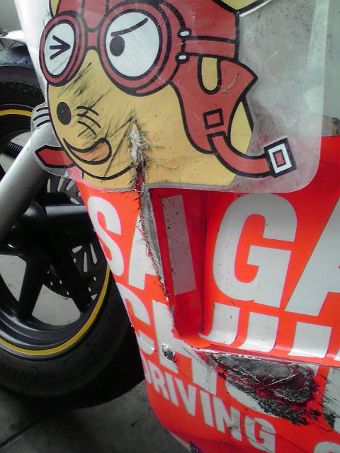 スクリーンも外装もマフラーも傷付き、まともに修理したら修理代も結構掛かりそうです。